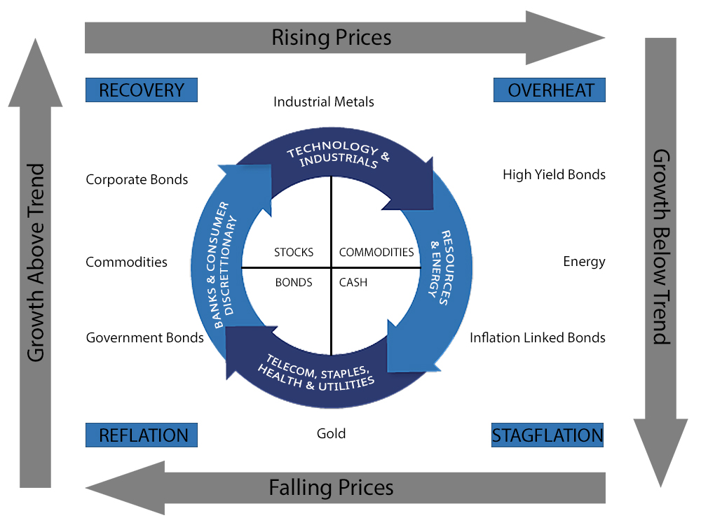Analysis of global profit & economic cycles is a core component of our strategies. We identify inflection points in global business cycles & allocate appropriately across asset classes, styles, size, industries & themes. Examples of assets & market segments we may favour at various points in the cycle are highlighted below.